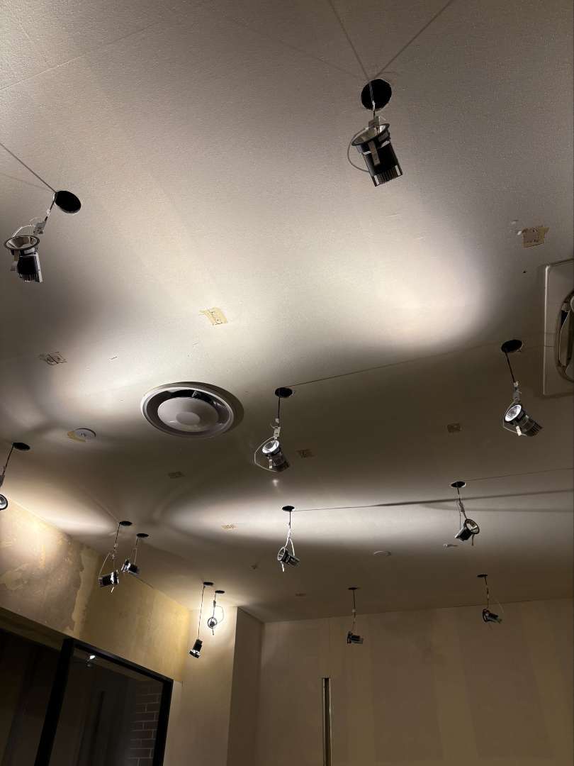 天井に設置されていたダウンライトは、できるだけ残す方針でしたが、配置を変更する必要があったため、一度取り外してから新しい位置に再設置しました。同様の作業を他の照明でも行い、既存設備を活かしつつ内装に合わせた配置に調整しました。